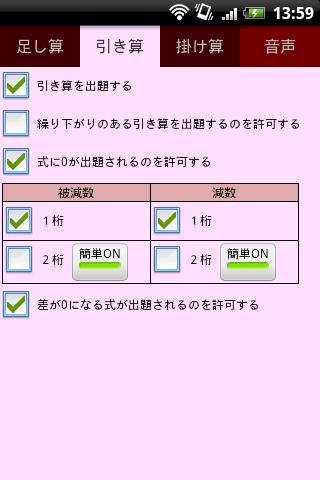 ・音声ON/OFF(問題の式の読み上げや、合否判定の効果音)や音量