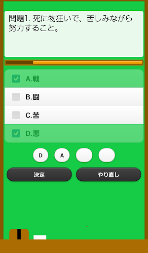 問題の意味に合った四字熟語を、四つの漢字を並べ替えて完成させる漢字クイズです。