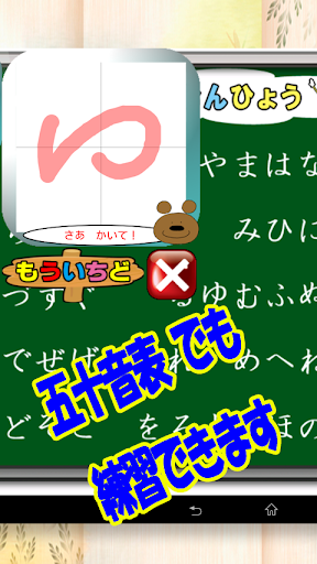 • 50音表から「ひらがな」を選んで、アニメーションのお手本を一画ずつなぞり、書き方・書き順の練習が出来ます。