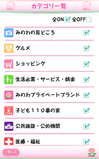 地図上に「みのわの見どころ」「グルメ」「ショッピング」「生活必需・サービス・娯楽」「みのわプライベートブランド」「子ども110番の家」「公共施設・公的機関」「医療・福祉」「避難所・AED設置場所」「企業・会社情報」を表示します。