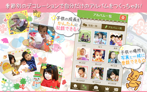スマホで撮影した子供の写真を、かわいいフレームやスタンプを使ってデコレーションすることができます。また、デコった写真は共有したり、「コメント」を書いたり、「いいね」して、みんなで盛り上がることも可能です。
