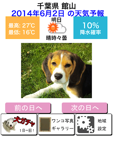 毎日の天気予報をチェックと一緒に可愛いわんこ(犬)の写真を見ることができます。
