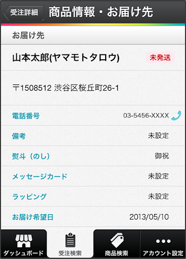 ・お届け先情報…発送状態、名前、郵便番号、住所、電話番号、備考、ギフト設定情報、・お届希望日・時間、配送会社、配送伝票番号、商品ID、型番、商品名、価格、数量、