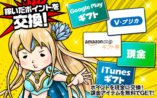 貯まったポイントは、Vプリカ、Amazonギフト券、iTunesギフト券、現金などに交換できるので、お小遣い(おこづかい)としてすぐに使うことができます。簡単操作でポイントがどんどん貯まるアプリです。