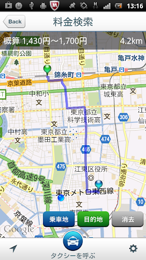 ・料金検索はGoogle Mapsを利用してルートを計算しており、実際のルートと異なる場合があります。また、概算料金には通行料・迎車料金・予約料金は含まれません。