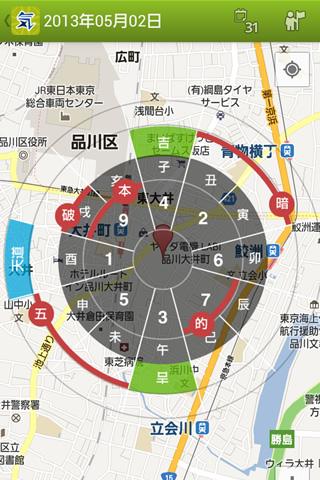 *九星気学では南を上にした方位盤が一般的ですが、このアプリでは地図に合わせて北が上になっています。