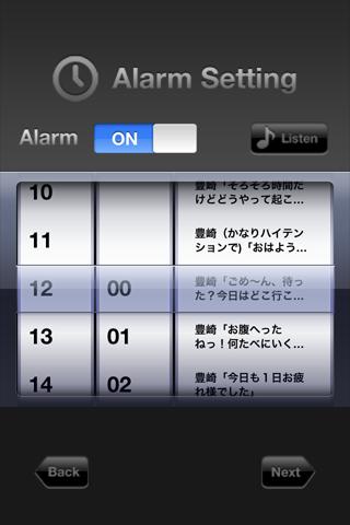 「Alarm List」から「Next」ボタンをタッチし、時間とセリフを設定画面へ。