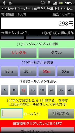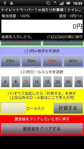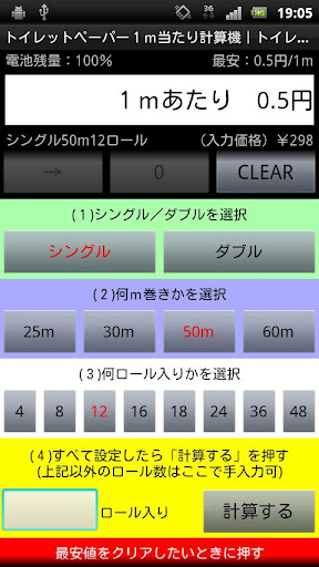 トイレットペーパーの1m当たりの価格を簡単に計算できるアプリです。