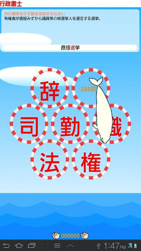空欄に該当する文字を選択し行政書士の重要語句を覚えよう。正解するとイルカが輪くぐりに成功します!