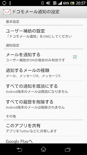 3. 「ユーザー補助の設定」で「ドコモメール通知」をONにする
