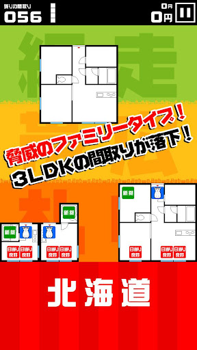 横列を揃え、間取りの全ての範囲を黄色に変えると間取りが消えます。間取りを消した場所(土地)や新築・日当り良好・ペット可物件によって家賃(得点)が決まります。