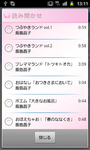 声優・朗読家「飯島 晶子」(いいじま あきこ)さんの優しい声音が11曲入ったよみきかせアプリです!飯島さんの素敵なボイスで楽しめるアプリ!