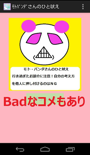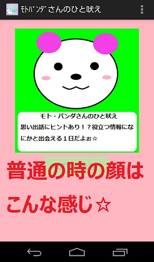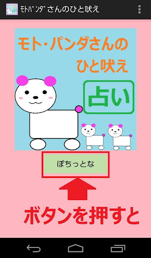 どもども^^;はじめまして。モト・パンダでーす。毎朝1ポチしてみてね。占い的なことを吠えたり、人生について何か吠えてみたりと・・・まぁ朝お出かけ前に見るテレビの占い的な感じですわ。テキトーにうけ流すのも良し、ちょっと気にしてみるのも良し、気にいらなかったらアンインストールするも良し・・・いあwそれは勘弁してね^^;テキトーにぽちっとなしてやってください。使い方は超簡単だよ!アプリ起動したら「ぽちっとな」ボタンをポチするだけ。モト・パンダが色々な顔して吠えます。時には激レアな顔するときもあるのでw楽しんで下さいな。アプリ終了するときはお手持ちのスマホの「戻るボタン」を押せば、次起動するときは初期状態で立ち上がるよぉ。「ホームボタン」押して終わった場合は次このアプリを起動させると前回の画面のまま立ち上がるよ。結果を持ち歩きたいときは「ホームボタン」もう一度占いたいときは「戻る」ボタンを押して戻ってね。アプリの話はこれくらいにしてw私が何故モト・パンダという名前になったのか・・・それは・・・パンダの絵が描けず、わけのわからない動物風?になったから「元・パンダ」→「モト・パンダ」になったわけじゃないからね。パ・・パンダくらいか・・か・・・描けるしぃ・・・よ、よゆーだしー・・・ゆるきゃら流行ってるからーこ・・・こんな感じの動物?にわ・ざ・としてるんだぉ。。。と・・・アホなプログラマーが言ってました。あいつ・・・絶対に絵心ありませんwあいつといっても私なんですけどねw素人にはこれが限界w占い風アプリ☆もっともっと勉強して楽しいアプリが作れるように頑張りますので応援よろしくお願いしまーす!