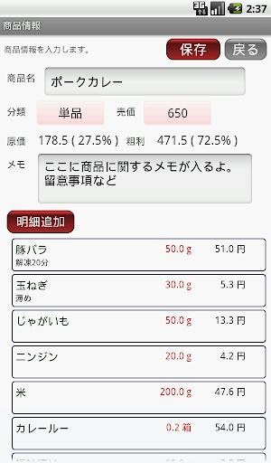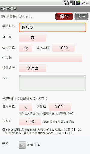 (原材料名、仕入単位/金額・仕入先、使用単位/換算数、歩留り、メモ)