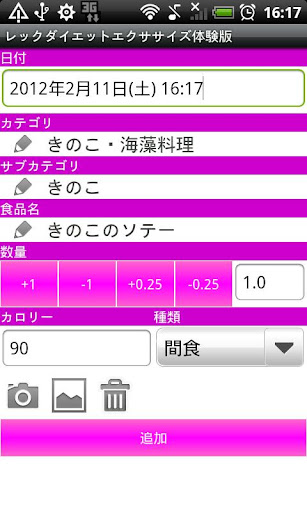 食品をカテゴリごとに分けて記録することができます。一度登録した食品はリストから選択して追加することができます。