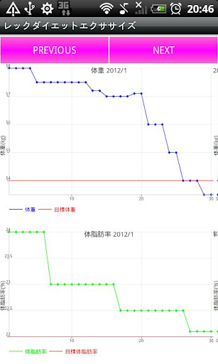 体重、体脂肪、摂取カロリー、消費カロリーは1ヶ月毎のグラフで確認できます。