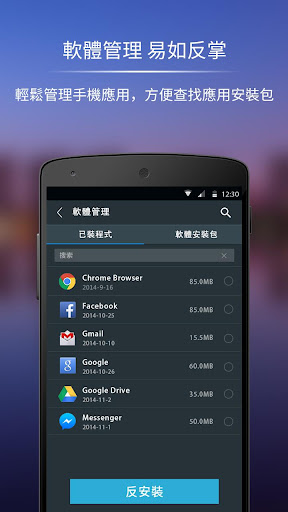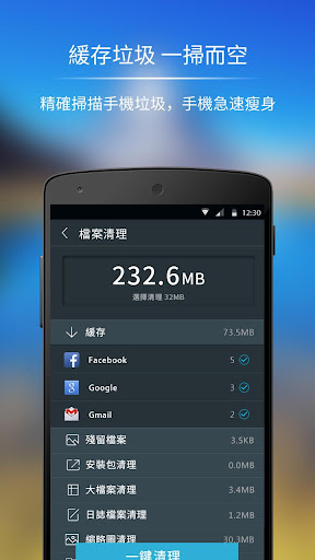 一鍵清理,完全免費的手機清理與加速應用,優秀的android優化工具。此應用是一款高效、快速、輕便的應用,可以幫助使用者快捷地清理記憶體,清除各種垃圾檔,清理緩存,管理與刪除用戶安裝的應用,數倍地加速使用者的手機,更好地提升手機性能與使用體驗。