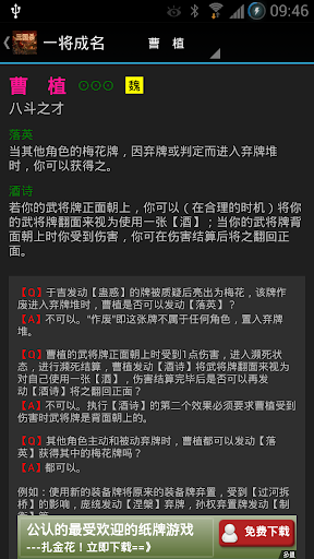 此App包含了基本牌、锦囊牌、军争包、风、林、火、山以及一将成名扩展包中的所有卡牌的资料速查,以及武将技能使用方法的FAQ。