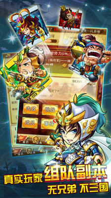 300余三国将领静候招募,升级、强化、组合卡牌完美融合,攻防搭配各有千秋,简约中体现谋略,拼武将更拼头脑,没有无敌的组合,只有更强的阵容。