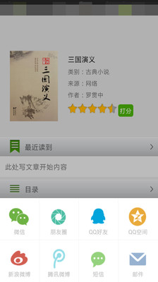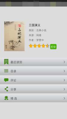 本程序包含《三国演义》全集,配有书签和字体调节功能. 《三国演义》是中国第一部长篇章回体历史小说,以描写战争为主,大概分为黄巾 浪漫主义改造现实主义之乱、董卓之乱、群雄逐鹿、三国鼎立、三国归晋五大部分。在广阔的背景上,上演了一幕幕波澜起伏,气势磅礴的战争场面,成功刻画了一千多个人物形象。