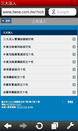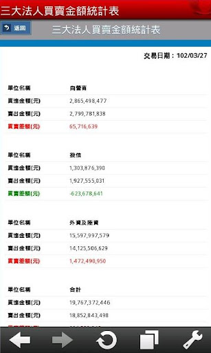 三大法人買賣金額統計表、外資及陸資持股前廿名、外資及陸資買超前五十名、外資及陸資賣超前五十名、投信買超前五十名、投信賣超前五十名、自營商買超前五十名、自營商賣超前五十名