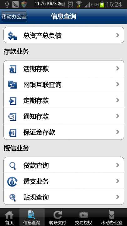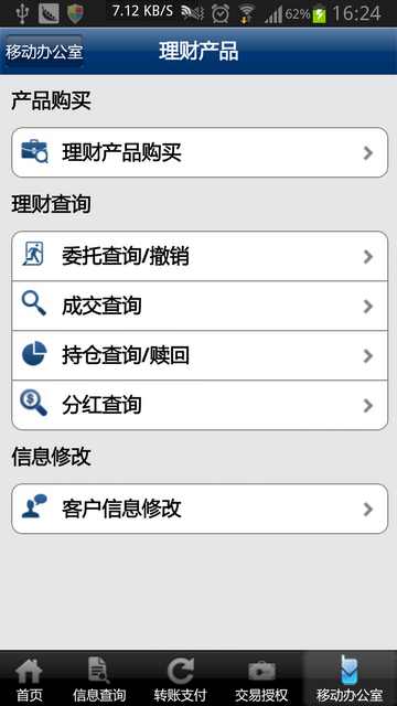 输入签约手机号码并进行身份认证后,可随时开展信息查询、转账支付、投资理财、集团管理等交易,以及各类金融交易的授权业务,让企业、事业单位的高管和财务人员不受时空限制,随心掌握各类存贷款和票据信息,完成业务审核及各类金融交易。其中信息查询不仅涵盖了企业、事业单位在我行所有存、贷款和票据信息的查询,而且包括网银互联账户信息查询,帮助企业、事业单位的高管和财务人员随时掌握跨行账户的余额和交易情况;投资理财服务涵盖了理财产品查询购买和银行账户与证券公司、期货公司、各类大宗商品交易市场的的资金互转、联动转账功能,以及理财产品委托、成交、持仓、分红和三方存管账户的余额、交易明细、对账单查询功能,帮助企业、事业单位把握投资先机;集团服务提供集团关系和下属单位的各类存贷款和票据信息,帮助集团企业随时掌控下属单位的金融业务;转账支付交易和各类金融交易授权服务支持网银、银企直连等跨渠道业务的交叉处理和跨企业业务管理,让企业、事业单位充分感受浦发银行以客户为中心,打造的多渠道整合的公司电子金融服务,以及便捷、高效、多样化的服务体验!