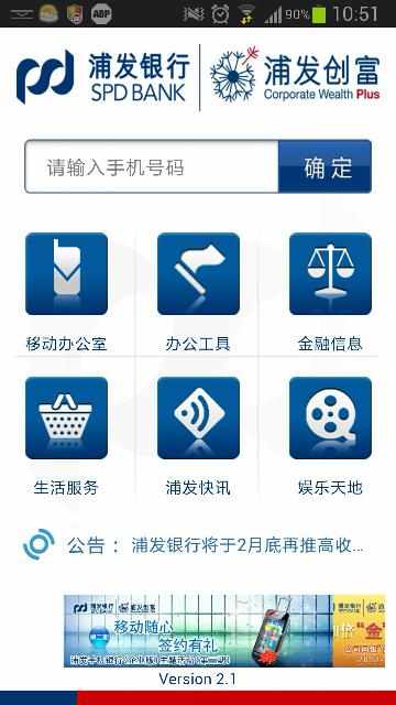 上海浦东发展银行推出手机银行(企业版)Android客户端服务软件,根据Android手机的特点,向企业、事业单位的高管和财务人员提供便捷、高效的公司电子金融服务,使用任何品牌电信运营商网络或无线WIFI网络都可轻松登录。