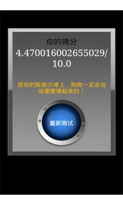 选取你的一张照片,扫描你的脸部细节,然后通过分析细节数据,给出一个1-10的等级,并且加上一些“评语”,等级越高说明你越丑,所以如果你的等级是10,估计你那张脸只有你妈妈想看了,以后白天就别出门了!总之很恶搞的一款软件,中,快拿去给自己或朋友评测评测吧!