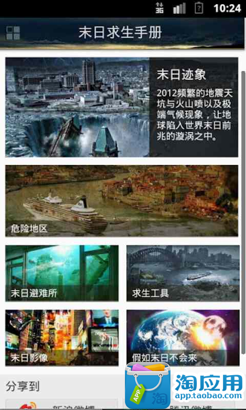 包含:末日求生手册,末日迹象,世界最危险地带,末日避难所,末日求生工具,与世界末日相关的电影,人类未来高科技的猜想!