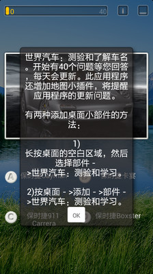 这款软件可以让你更加深入的了解世界汽车的车名,采用的是问答的形式开始会有40个问题等着你回答,每天都会有更新,不管你对车了解与否,这款软件都能让你学到有关汽车的知识。