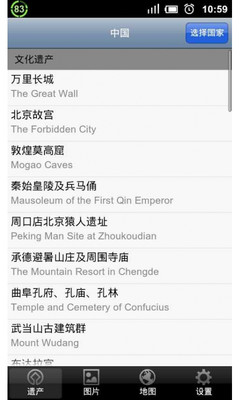 支持25个国家的世界遗产信息:意大利、西班牙、中国、法国、德国、墨西哥、印度、英国、俄罗斯、美国、澳大利亚、巴西、希腊、加拿大、日本、伊朗、瑞典、葡萄牙、波兰、捷克、比利时、秘鲁、瑞士、土耳其、韩国。