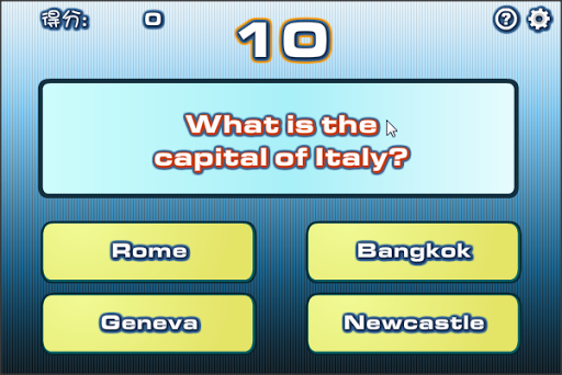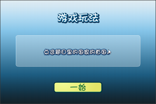 不论您是旅游爱好者、或纯粹是地球村的一分子,都快来挑战世界首都问答吧。在这个游戏里,您的目标是在4个城市里选出正确的国家首都。开始时会出现一道问题,而4个城市的名称则位于问题的下方。您会有10秒时间回答每道问题,而余下时间会在画面的最上方显示。点击其中一个方格回答问题,若果答案是正确的,您就会因应所余下的秒数而获得分数。若果答案错误或是限时结束,您就不能取得分数。快捷而准确地完成全部3个关卡,成为世界之王!