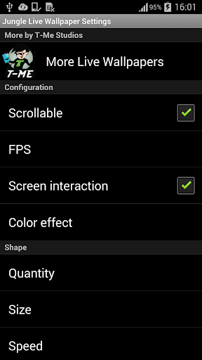 您可以增加元素的大小、速度,或者密度,还可以选择三种不同的颜色效果和三种不同的颜色强度。若要自定义,打开应用,点击“设置Live Wallpaper”,然后点击“设置”