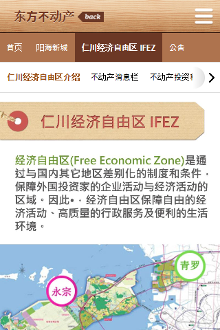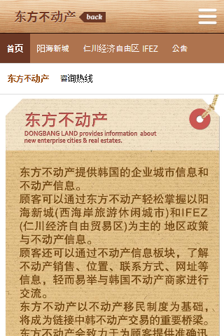 东方不动产提供韩国的企业城市信息和不动产信息。顾客可以通过东方不动产轻松掌握以阳海新城(西海岸旅游休闲城市)和IFEZ(仁川经济自由贸易区)为主的 地区政策与不动产信息。顾客还可以通过不动产信息板块,了解不动产销售、位置、联系方式、网址等信息,轻而易举与韩国不动产商家进行交流。东方不动产以不动产移民制度为基础,将成为链接中韩不动产交易的重要桥梁。东方不动产会致力于为顾客提供准确迅速的情报。