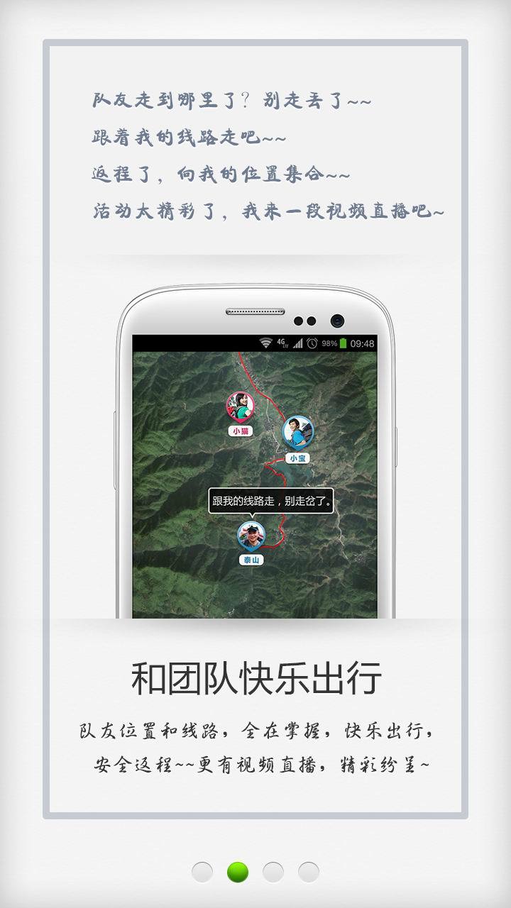 *和你的团队一起,实时显示队友的位置和他的线路,带队不“丢人”,是领队和导游们的必备利器!~~你还可以将团队活动的实况通过图片、视频、语音、文字实时分享,让你的亲友们一起来围观吧!