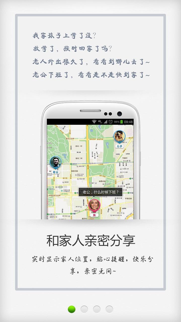 *和你的家人一起,亲密分享!~~老公/老婆下班了没有?孩子是否按时上学、按时回家?家里老人外出到哪里了?一目了然,全在两步路圈子!~~你还可以设定离开距离提醒和区域告警,远离危险,平安相伴!