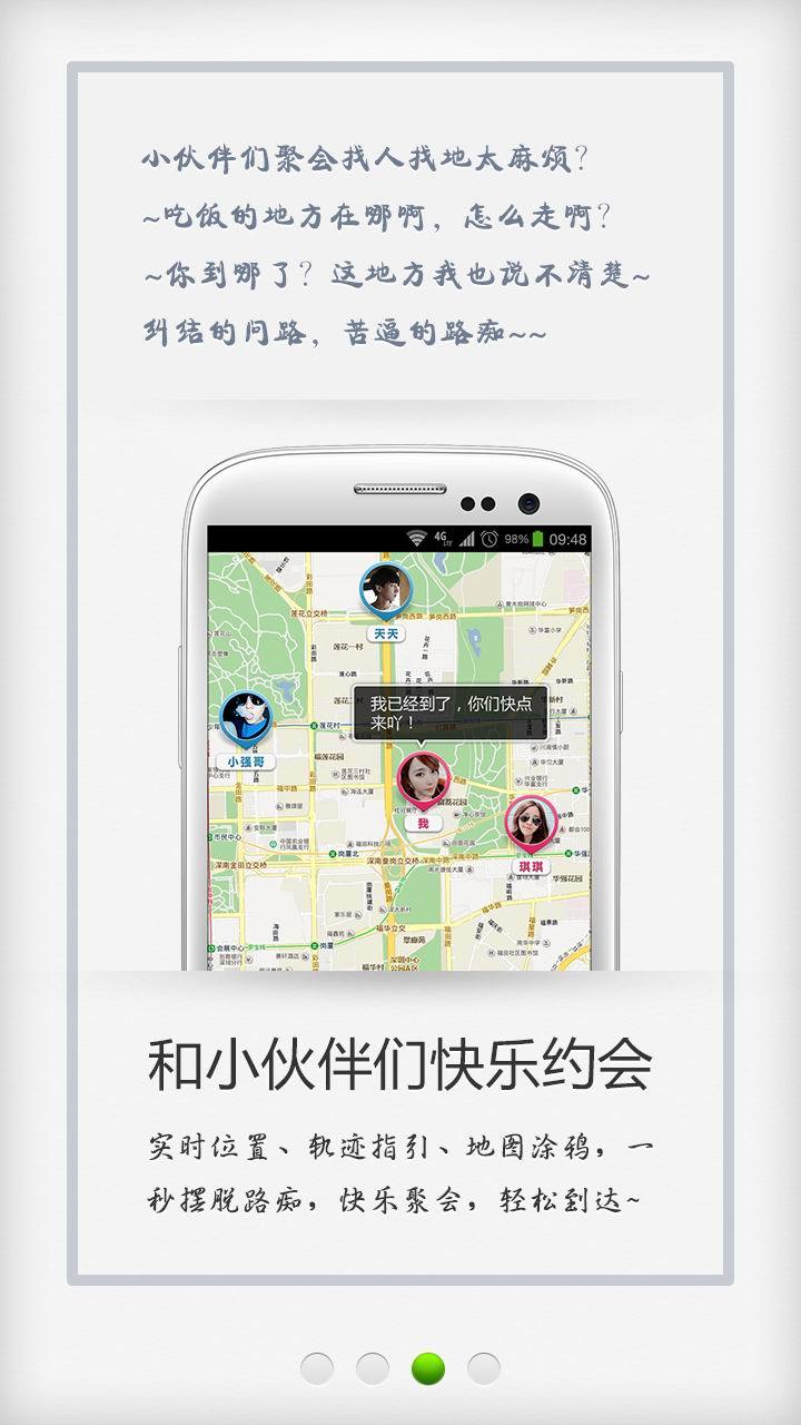 *和你的密友小伙伴们一起,逛街、聚会,不必再在找人找地上面浪费时间了,实时位置、轨迹指引、地图涂鸦,帮你快速到达,免去不断电话问地问路的麻烦。
