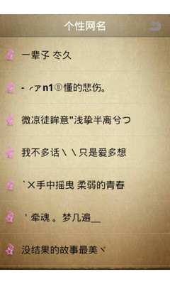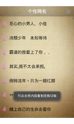最新、最全、最流行的个性网名!十一个精选网名分类,帮助你快速定位喜欢的范围!点击手机屏幕即可复制网名,方便又简单!让您迅速成为网络焦点!