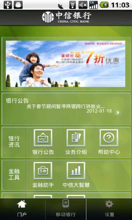 门户:优惠活动、银行公告、业务介绍、帮助中心、金融助手、中信大智慧、优惠商户、网点地图等功能。