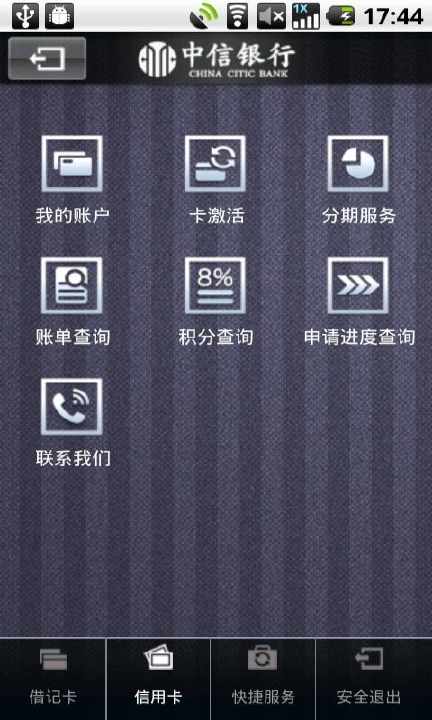 信用卡:我的账户、卡激活、分期、分期查询、账单查询、积分查询、申请进度查询等功能。