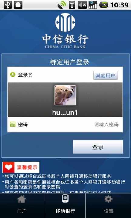 “中信银行移动银行(Android手机版)”闪亮登场。该产品是根据Android系统自身的的特点而研发的移动金融服务系统,充分贴合Android系统的特点,软硬按键结合、可自适应不同品牌型号的Android手机屏幕尺寸等,为客户提供贴身的移动金融服务。