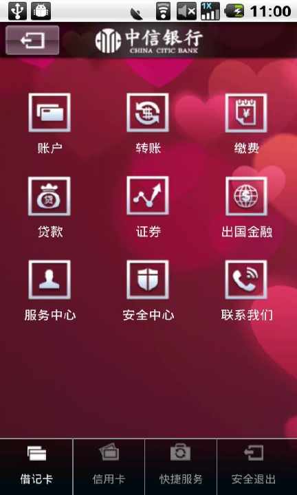 借记卡:账户、转账、缴费、贷款、证券、出国金融、服务中心、安全中心等功能。