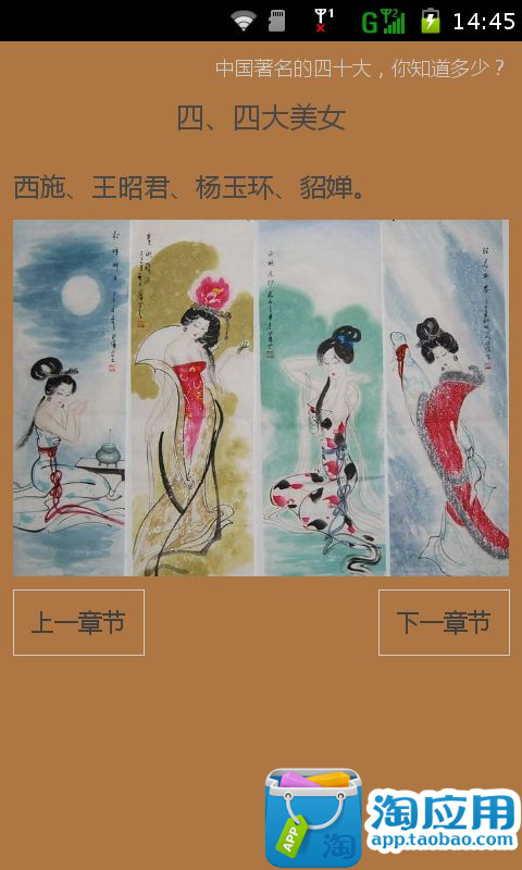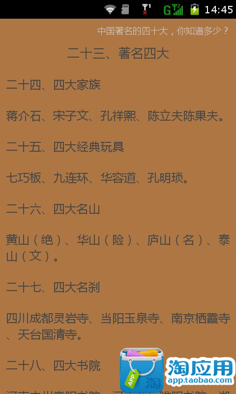 一般我们都知道四大名著,西游记、红楼梦、三国演义、水浒传,但是著名的四十大你知道吗?四大才子、四大才女、四大菜系、四大名山、四大书院等等,赶快跟随我一起学习一下吧!
