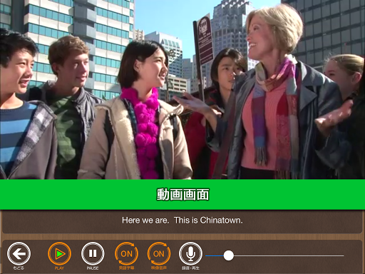 教科書本文を実写化した映像を視聴できる画面です。※対話形式のページのみ収録