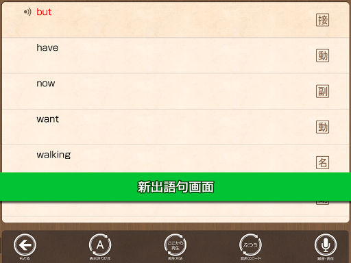 新出語句の音声を聞いたり,日本語訳を確認したりすることができる画面です。以下の機能を使って,1語ずつあとについて発音したり,日本語訳を見て対応する英単語を発音したり…さまざまなパターンで新出語句の学習ができます。