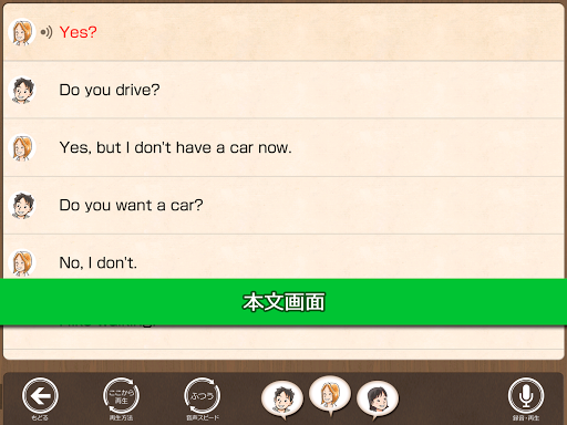 教科書本文の音声を聞くことができる画面です。以下の機能を使って,スピードを変えて音声を聞いたり,1文ずつあとについて発音したり,役割練習をしたり…さまざまなパターンで本文の学習ができます。