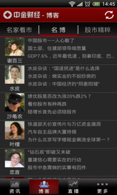 在这个信息化爆发的时代,为提供给股票投资者更加快速、便捷、及时财经股票资讯服务,中金在线在Android系统中强力推出财经股票资讯移动应用——【中金财经】是中国最大财经门户网站中金在线专为广大股民和财经股票爱好者设计研发的软件,中金财经将每日更新国内外经济热点要闻,涵盖股票、港股、基金、债券、期货、外汇、黄金、银行、保险、投资等金融理财资讯。等各方面资讯,让您无论何时、何地都能第一时间了解当下最新的投资热点和股票动向,第一手股票信息。将著名财经博客—【中金博客】搬上手机,这里集合众多名家、机构、学者和民间高手。谢百三、水皮、叶檀、忠言、花荣、股海指南针、沙黾农、股道易简、叶弘、 徐小明8、叶荣添风云、中金访谈、股王争霸赛、跑赢大盘的王者、股海豹子、会飞的小毛驴、tyj天赢居、陈实等一大批著名财经博主为用户提供了丰富多样的 股市信息及财经新闻,为您引导正确的投资方向。此外,在线直播功能,权威专家坐镇,在线解盘。深沪指数、大单动向、上市公司新闻、全球财经指数等信息将一网打尽,让您不看大盘对股市动态也能了如指掌。专家名师在线答疑,为您引导正确的股票投资方向,一手掌握股市大盘,有钱人的梦想近在眼前。