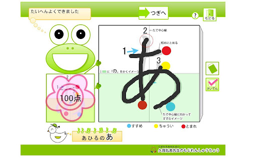 子供でもわかりやすい信号をイメージして、筆を進める部分には青色、注意する部分には黄色、止める部分には赤色の三色を表示し、筆順と文字の形をゲーム感覚で-