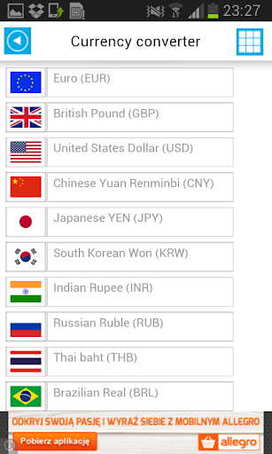 - 货币转换器:欧元,英镑,美元,中国佑安,日元,韩元,卢比,俄罗斯卢布(离线)