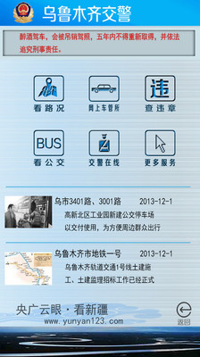 通过智能手机,运用无线网络访问“乌鲁木齐交警”手机客户端,可随时随地获取市区内各类道路实时路况视频信息、车辆违章信息、停车场信息、公交信息,并能够与交警实时沟通交流获取最新交通资讯。